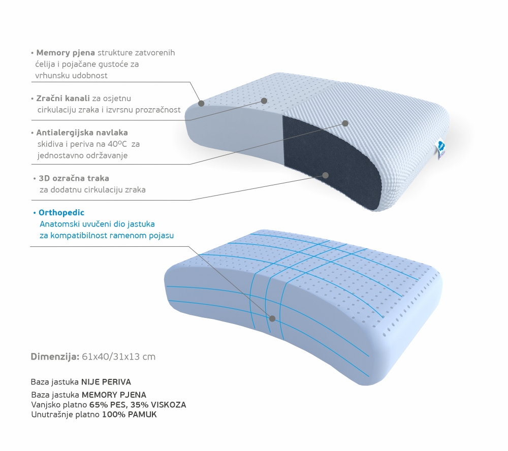 - Orthopedic - anatomski uvučeni dio jastuka za kompatibilnost ramenog pojasa.