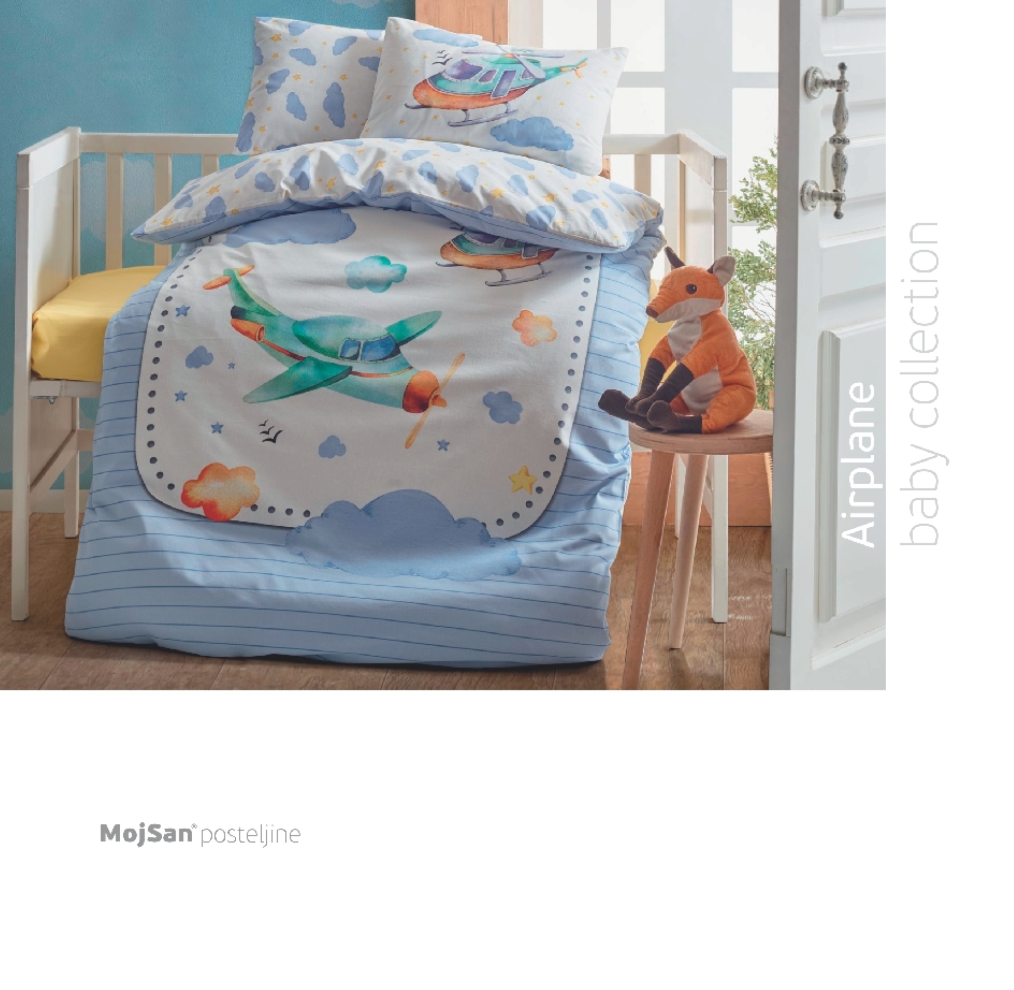 Posteljine MojSan BABY su dostupne u dezenima za dječake Airplane, djevojčice Lila te univerzalnu opciju Uni.